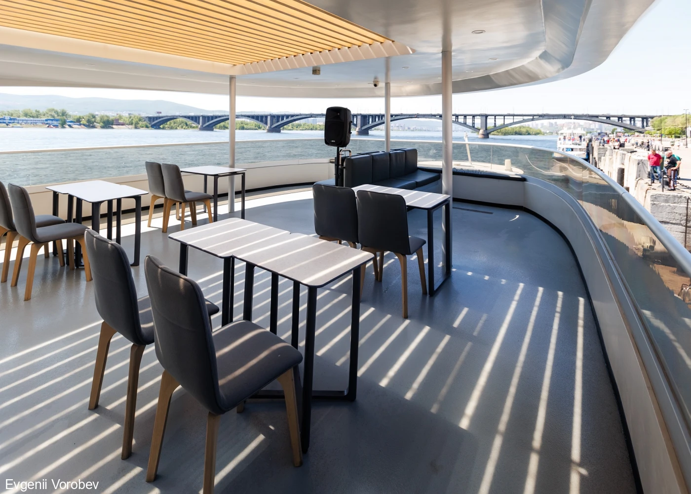 Электроход пройдёт рядом с величественным Коммунальным мостом, который уже давно стал лидером в Красноярске среди других своих братьев. Затем судно развернётся и проследует к причалу отправления. Мы будем проплывать Краеведческий музей, деревянную усадьбу Г. В. Юдина.