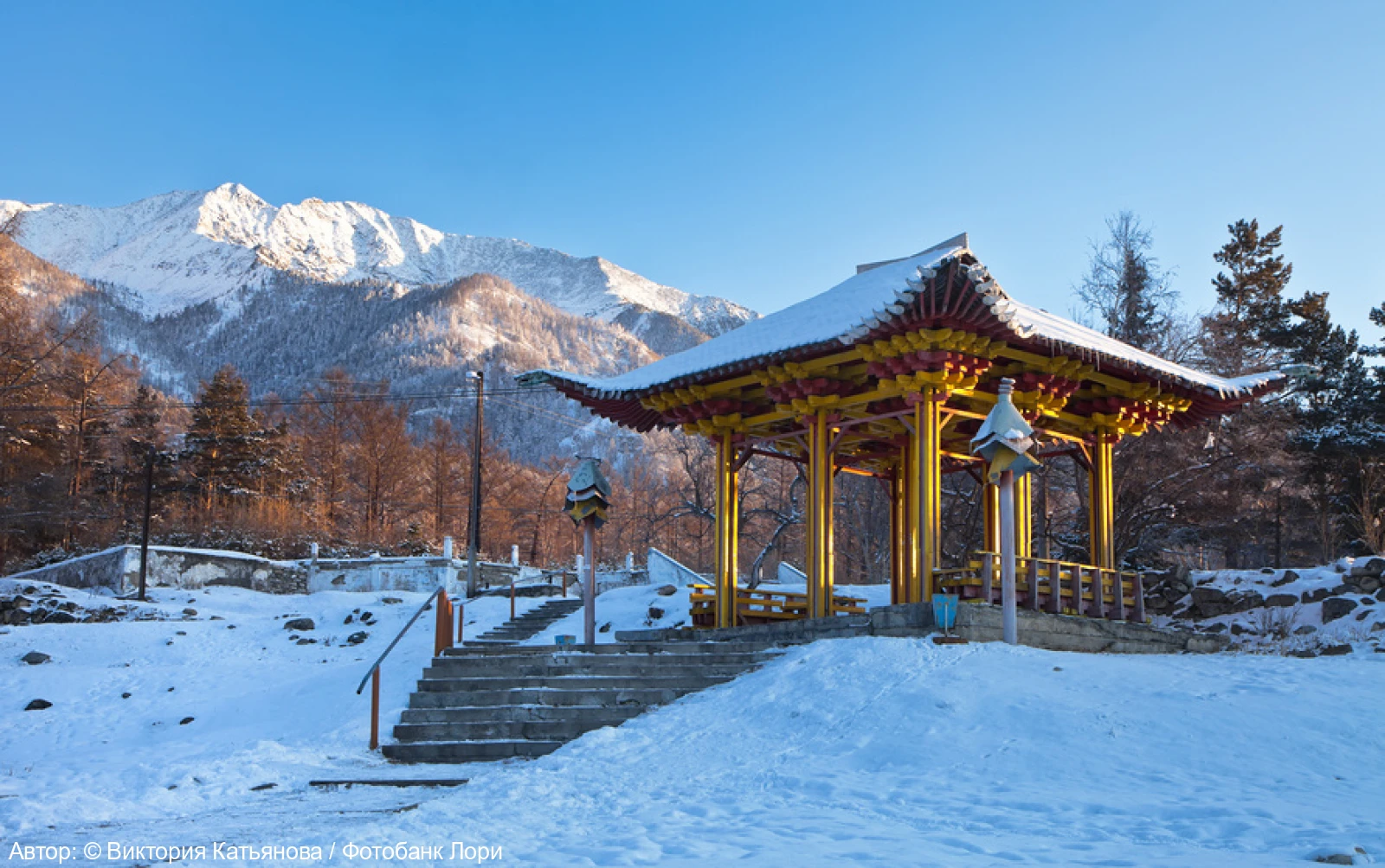 Первая остановка увлекательного маршрута – на границе с Бурятией, где находится ступа Даши Гама, что в переводе на русский означает «Множество дверей счастья». Вы поднимитесь к ней по каменной лестнице, охраняемой каменными львами.