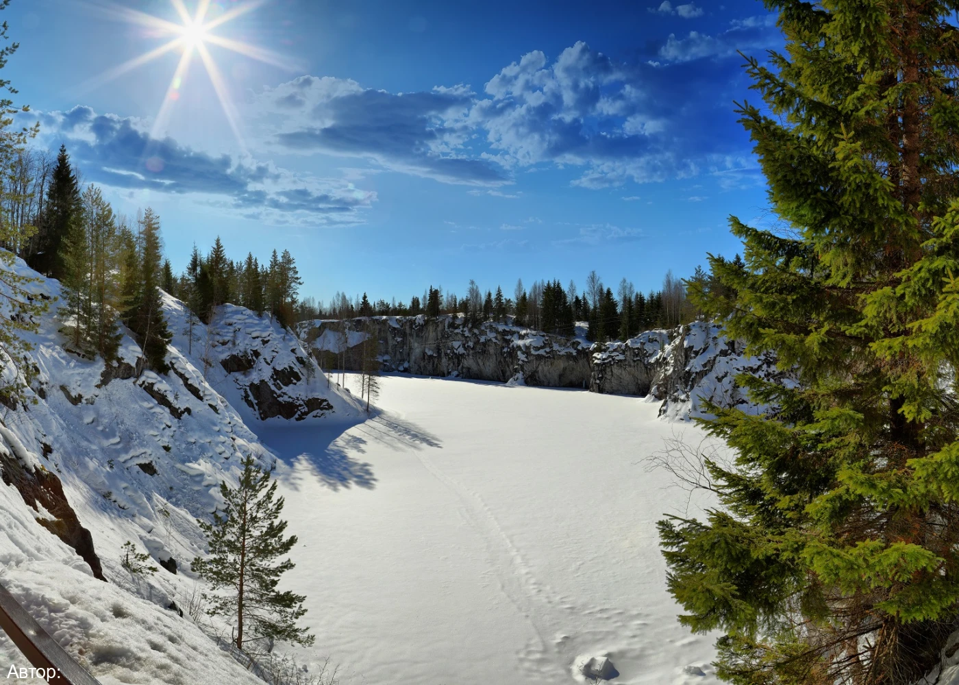 Центром интереса является Мраморный каньон – большое, вытянутое с юга на север озеро с кристально чистой водой и отвесными берегами, состоящими из настоящего мрамора. Именно здесь когда-то добывали этот декоративный камень для отделки архитектурных шедевров Санкт-Петербурга. А в окружении темнеющих хвойных деревьев, снежного убранства и цветной подсветки на скалах пейзаж получается действительно сказочным!
