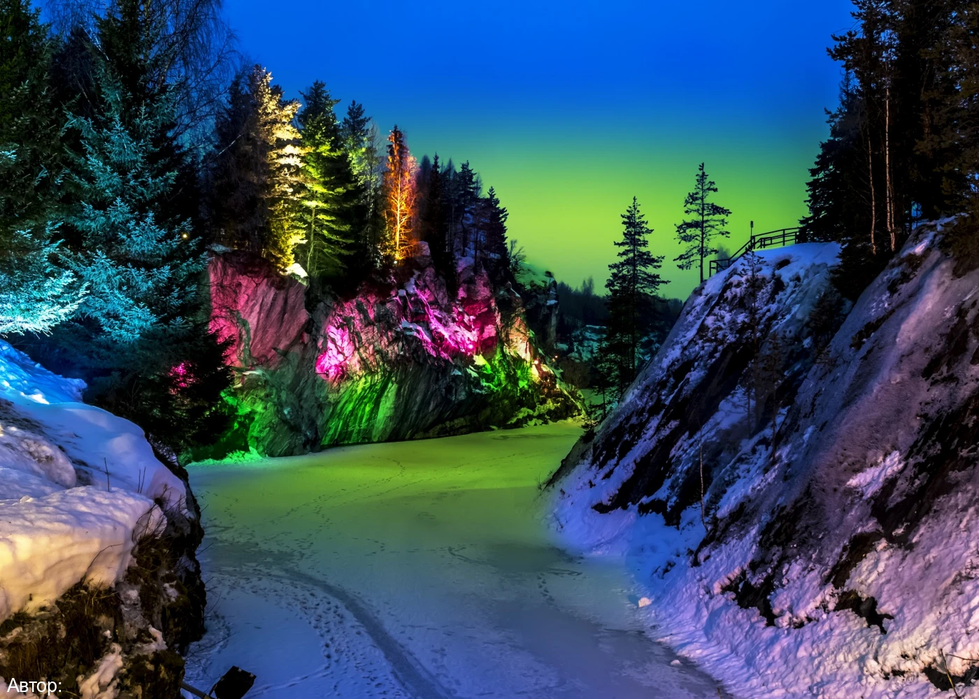 Горный парк Рускеала – главная круглогодичная достопримечательность Карелии. Территория горного парка огромна. Центром интереса является Мраморный каньон – большое, вытянутое с юга на север озеро с кристально чистой водой и отвесными берегами, состоящими из настоящего мрамора. Именно здесь когда-то добывали этот декоративный камень для отделки архитектурных шедевров Санкт-Петербурга. А в окружении темнеющих хвойных деревьев, снежного убранства и цветной подсветки на скалах пейзаж получается действительно сказочным!