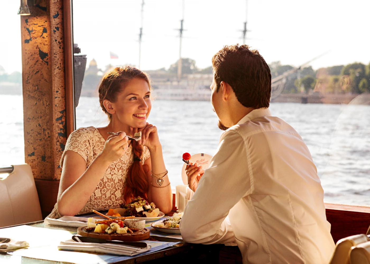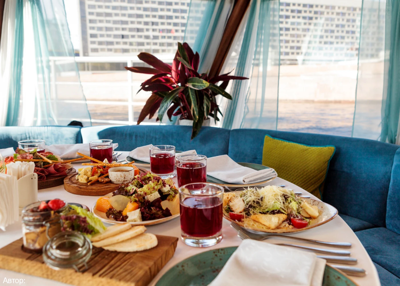 Также Вы сможете совместить увлекательную экскурсию с завтраком или ланчем. На борту теплохода работает ресторан с изысканными блюдами и напитками из нового меню.