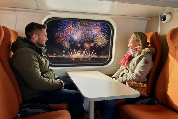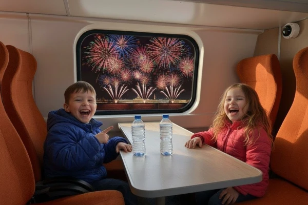 Прекрасный большой теплоход! На палубе встречает приветливый персонал. Не ожидали,что такой большой корабль у нас будет. Вышли на корму, так как именно там можно не через окно наблюдать за всей феерией. Есть столики и посадочные места. Сверху крыша. Мы ..