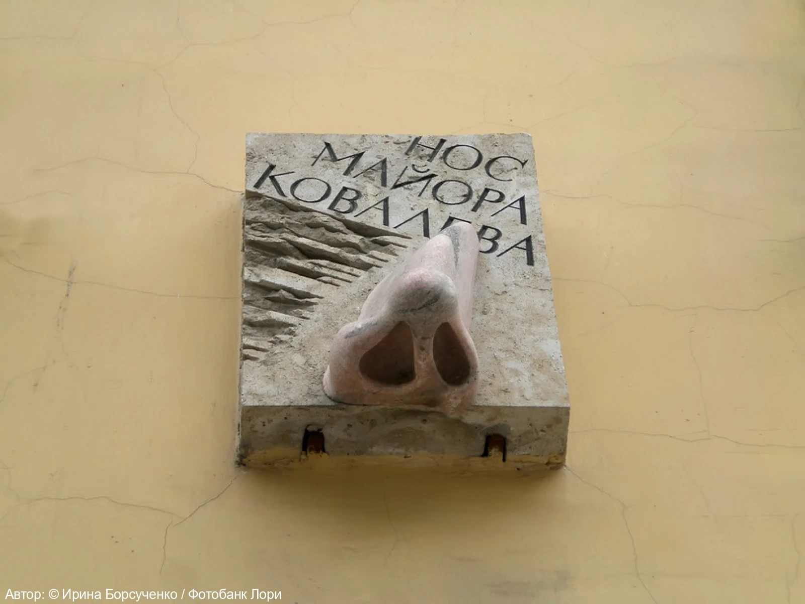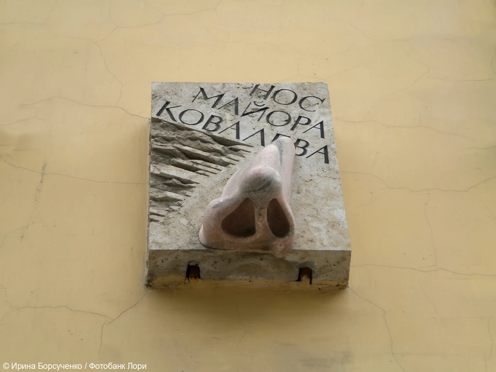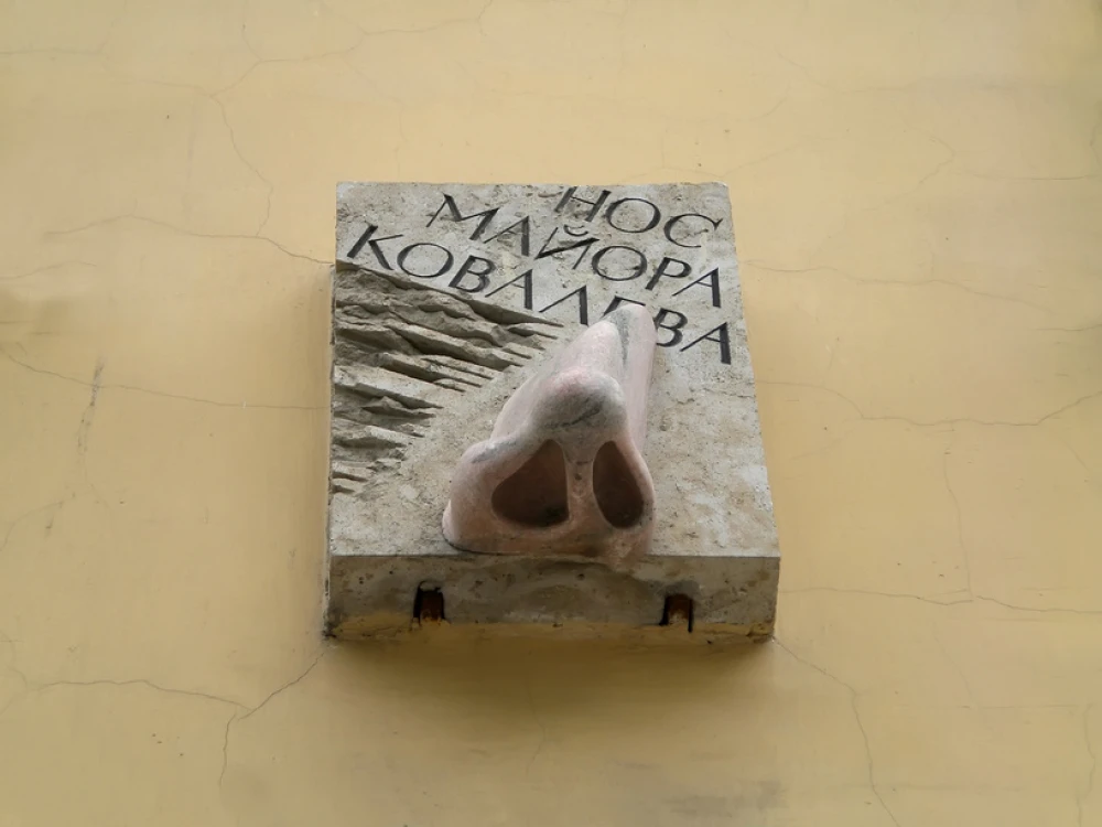 На невзрачной стене обычного дома под номером 11, расположенного на проспекте Вознесенского, есть удивляющий прохожих памятник. Это небольшая табличка из серого мрамора, на которой уютно расположился человеческий нос. Надпись, выполненная большими, четкими буквами сообщает зрителям, что это «нос майора Ковалева».