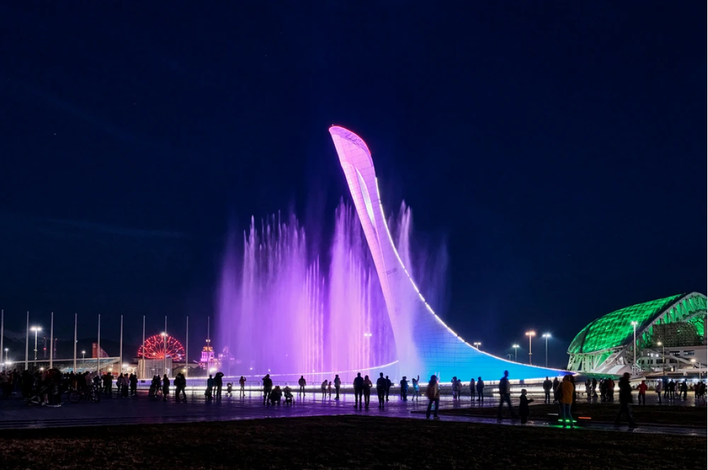 Располагается удивительный фонтан в Адлере. Его возвели специально для церемоний открытия и закрытия Олимпиады в Сочи. После его оставили для туристов и путешественников.