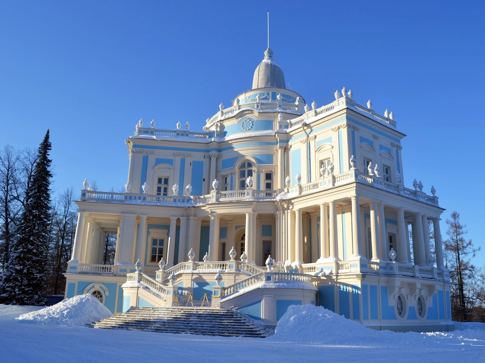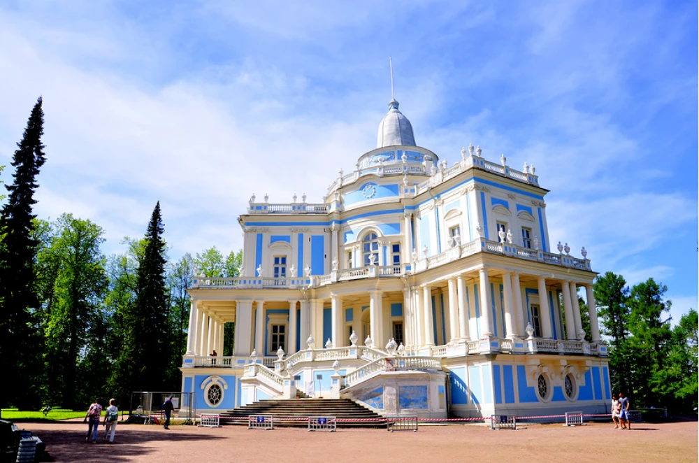 Воздушное небесно-голубое с белоснежно отделкой здание в Верхнем парке Ораниенбаума, хорошо видное со Старо-Петергофской трассы, - это павильон Катальная горка. Сохранившееся многоступенчатое - здание лишь часть грандиозной конструкции, сооруженной Антонио Ринальди для императрицы Екатерины II.