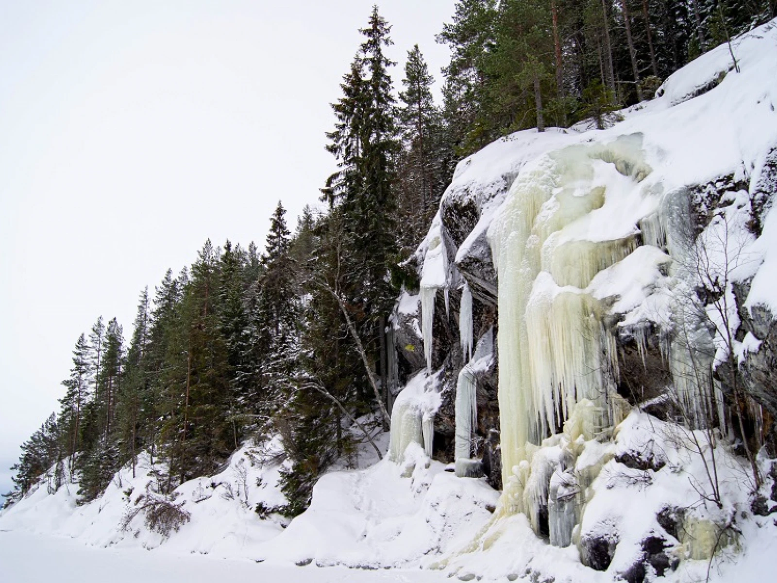 Берег полностью из камня. Об эти безжизненные скалы разбиваются спокойные воды озера. Скалистый берег плотно засажен маленькими и большими соснами, отчего по всей территории ощущается невероятно свежий воздух. Сами деревья порой причудливы по форме, что придает им особой фантастичности и сказочности. Если отойти чуть дальше, то можно увидеть достаточно сильный обрыв.