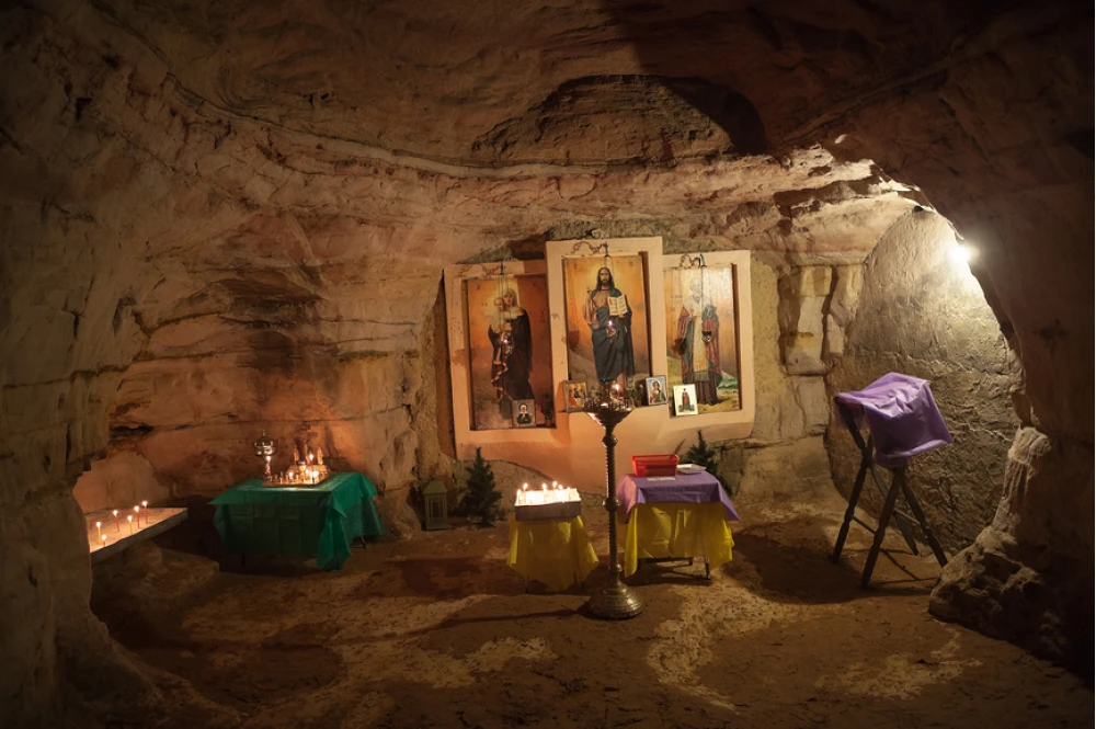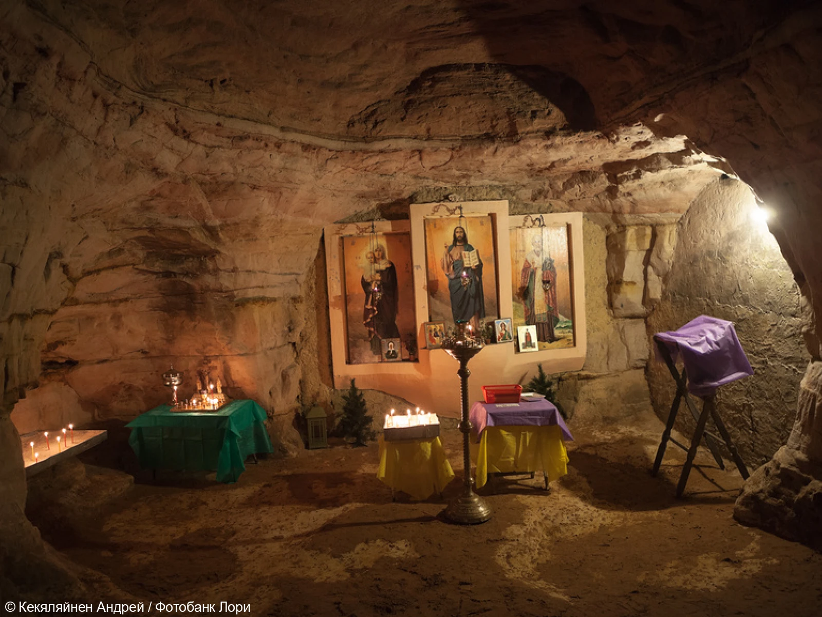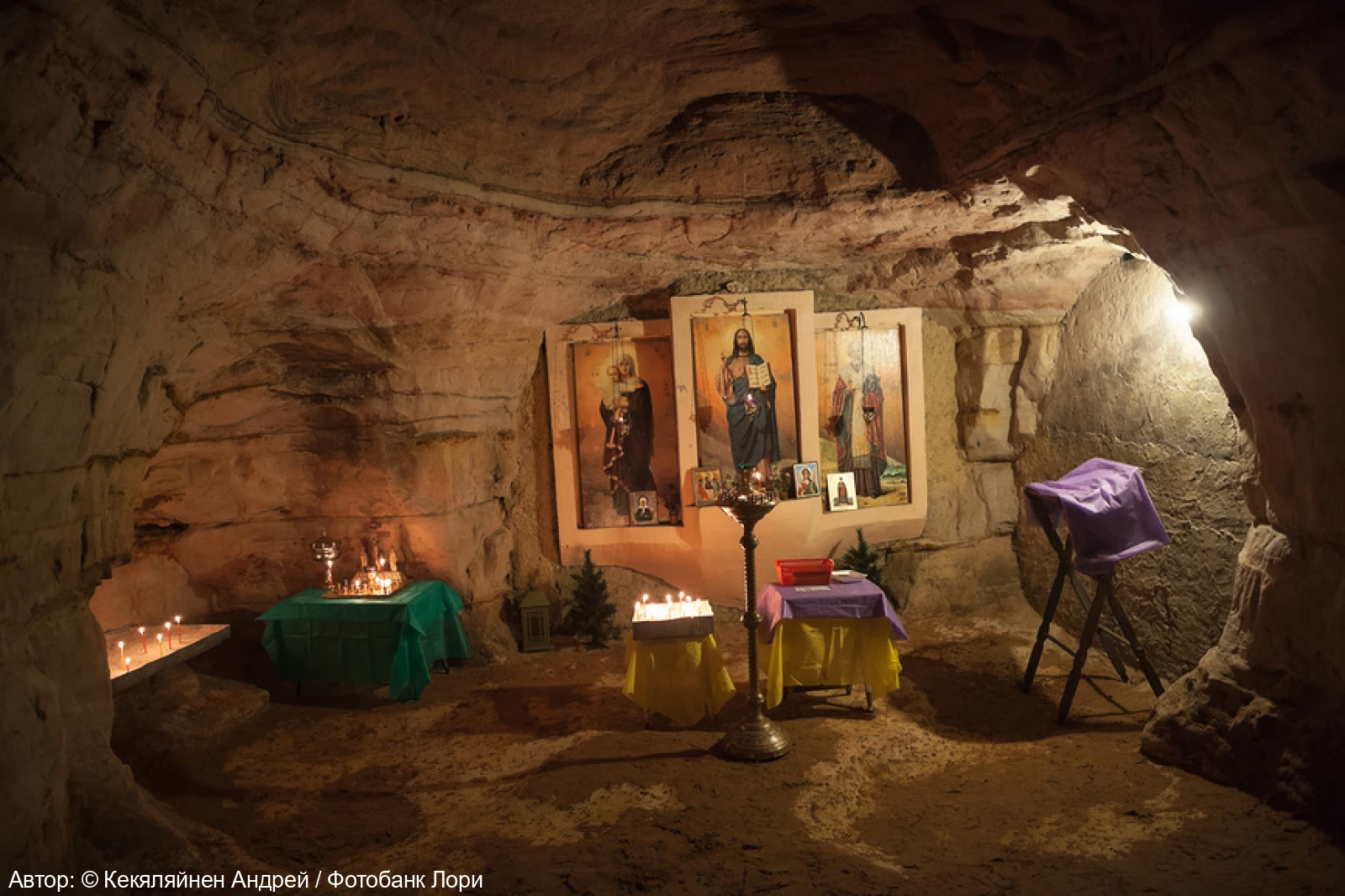 Часовня находится в большом зале Левобережной пещеры. Площадь подземного зала около 60 кв.м. Одновременно в нем могут находиться не более 60 человек.