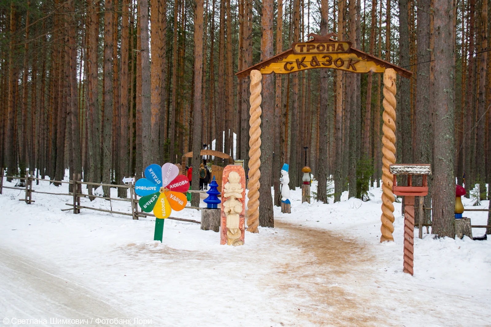 Во владениях доброго Дедушки Мороза, чтобы попасть в его резной терем, необходимо пройти через Волшебный лес. А ведет через прекрасный сосновый бор Тропа сказок. Вход на тропу – через специальные деревянные ворота, перед которыми вывешены стихотворные правила, призывающие «соблюдать чистоту и беречь красоту».