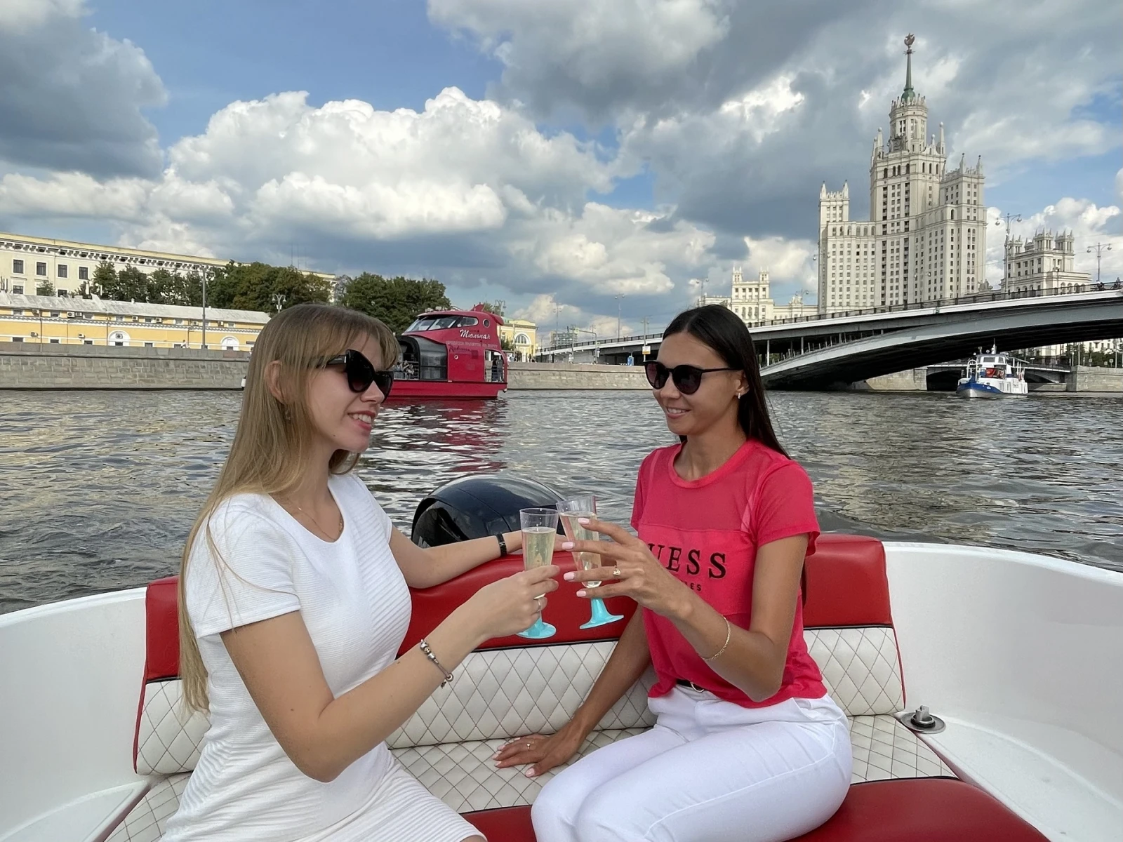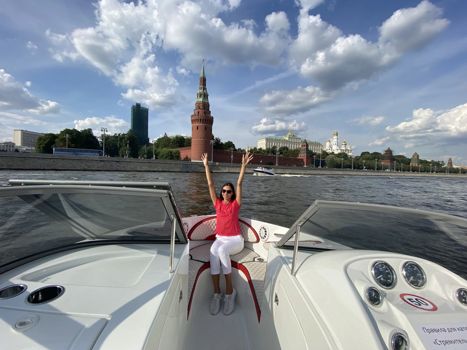 В катере установлена современная музыкальная аудиосистема с возможностью подключения любого устройства через Bluetooth/AUX. Стильным украшением в вечернее время является подсветка салона алого цвета в цвет борта катера. Приятным бонусом для любителей гаджетов является розетка 220 Вт. Для безопасного размещения вещей во время движения катера предусмотрены специальные отсеки.