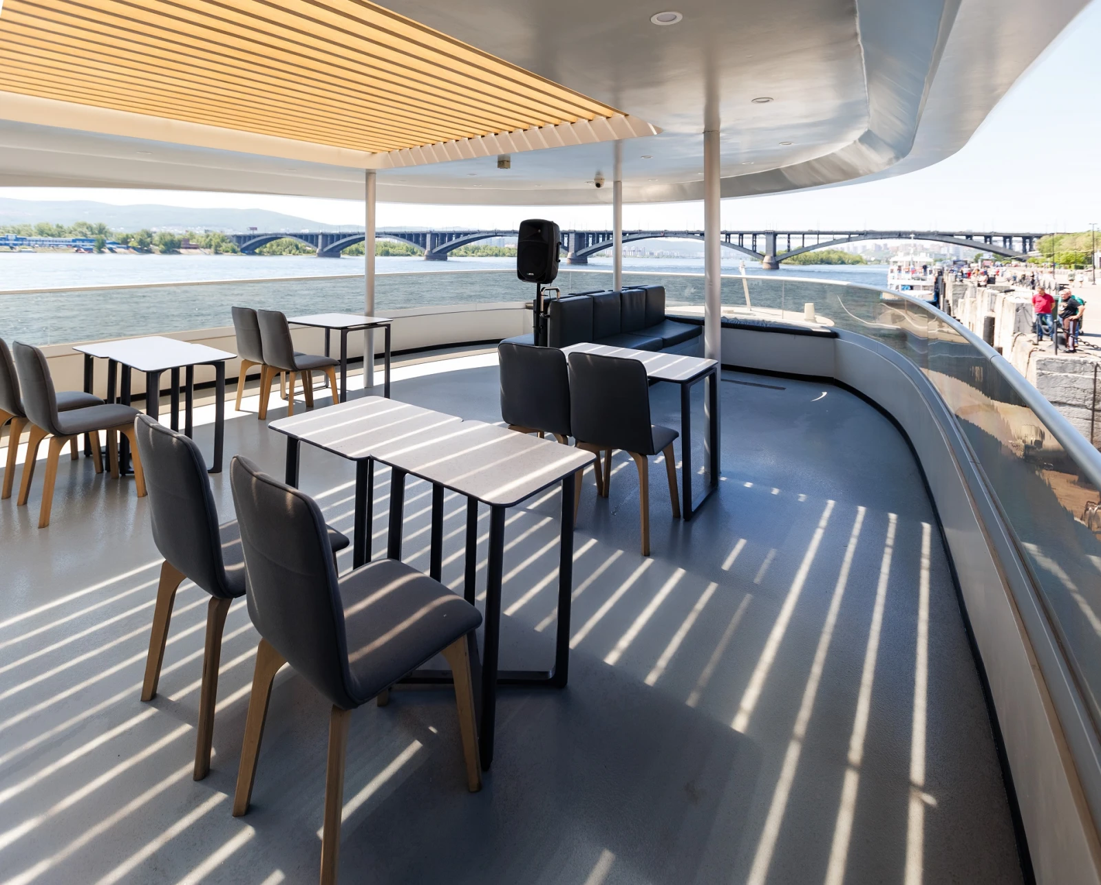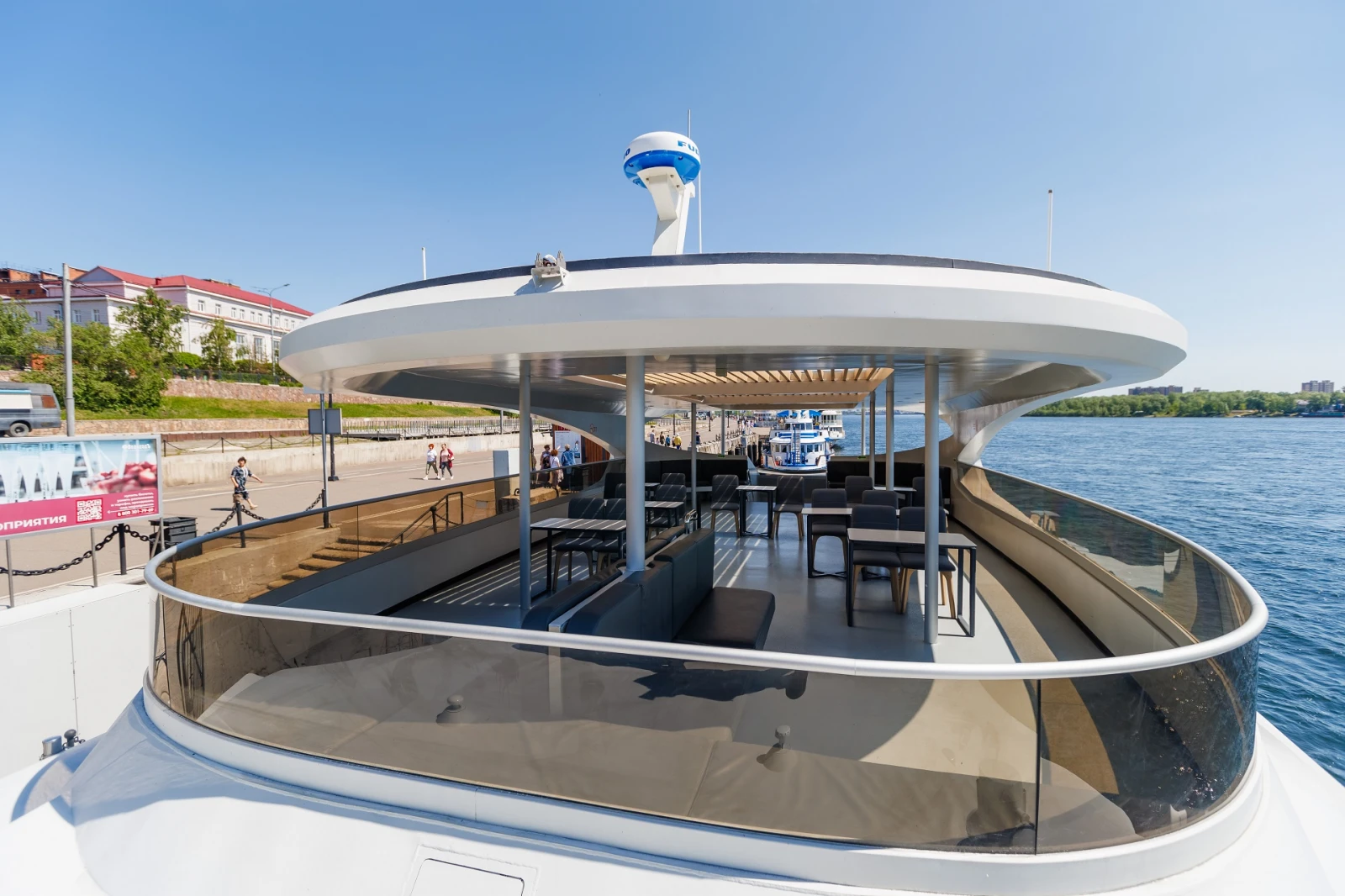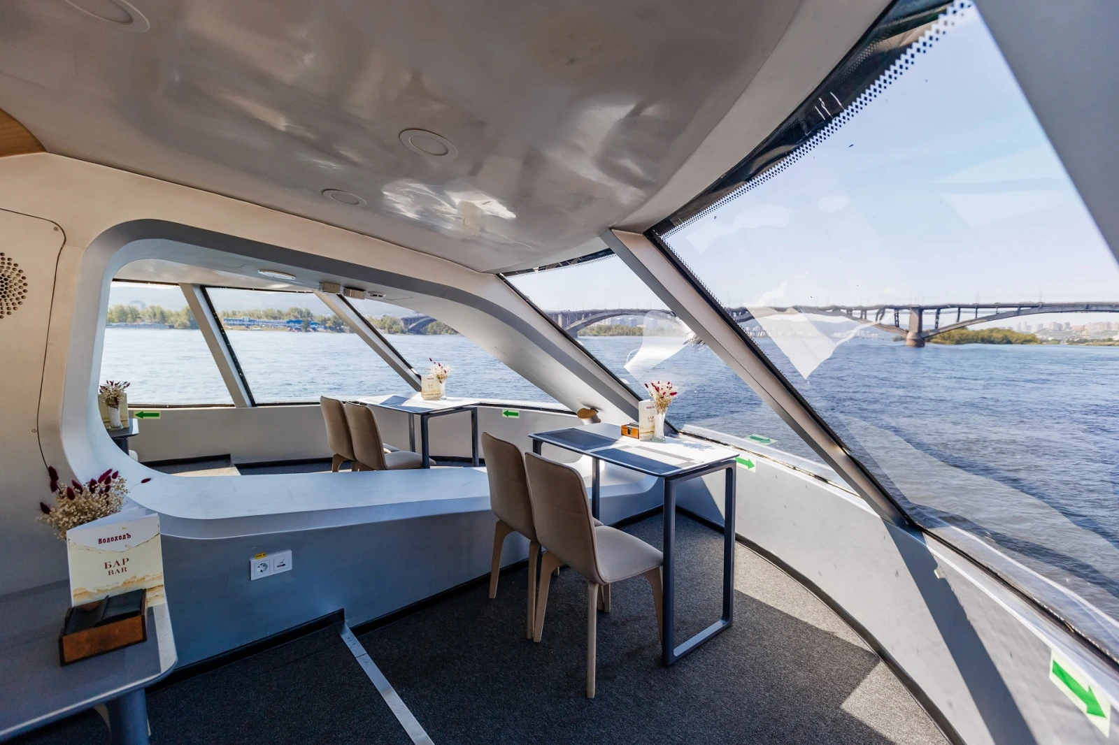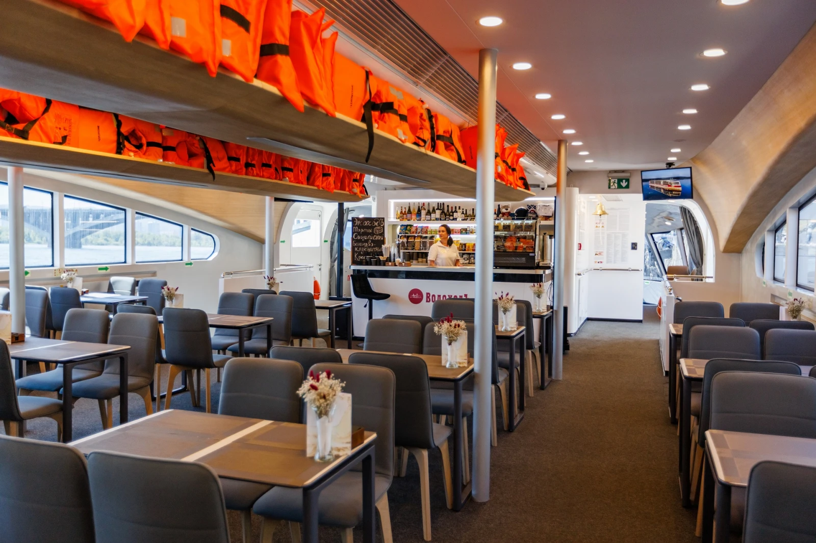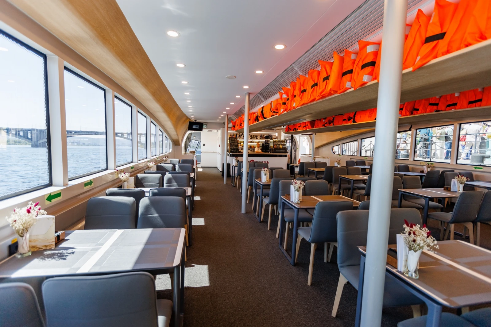 Для удобства гостей на борту имеются бар, кондиционер, розетки для зарядки гаджетов и туалеты. Верхняя палуба частично открыта и защищена от осадков тентом для комфортных прогулок на свежем речном воздухе.