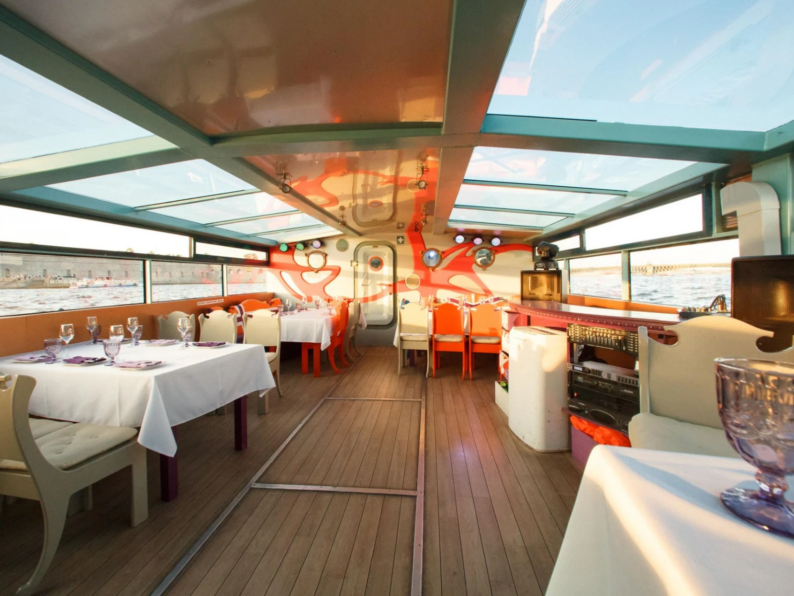 Современный клубный прогулочный теплоход с современным внутренним дизайном.