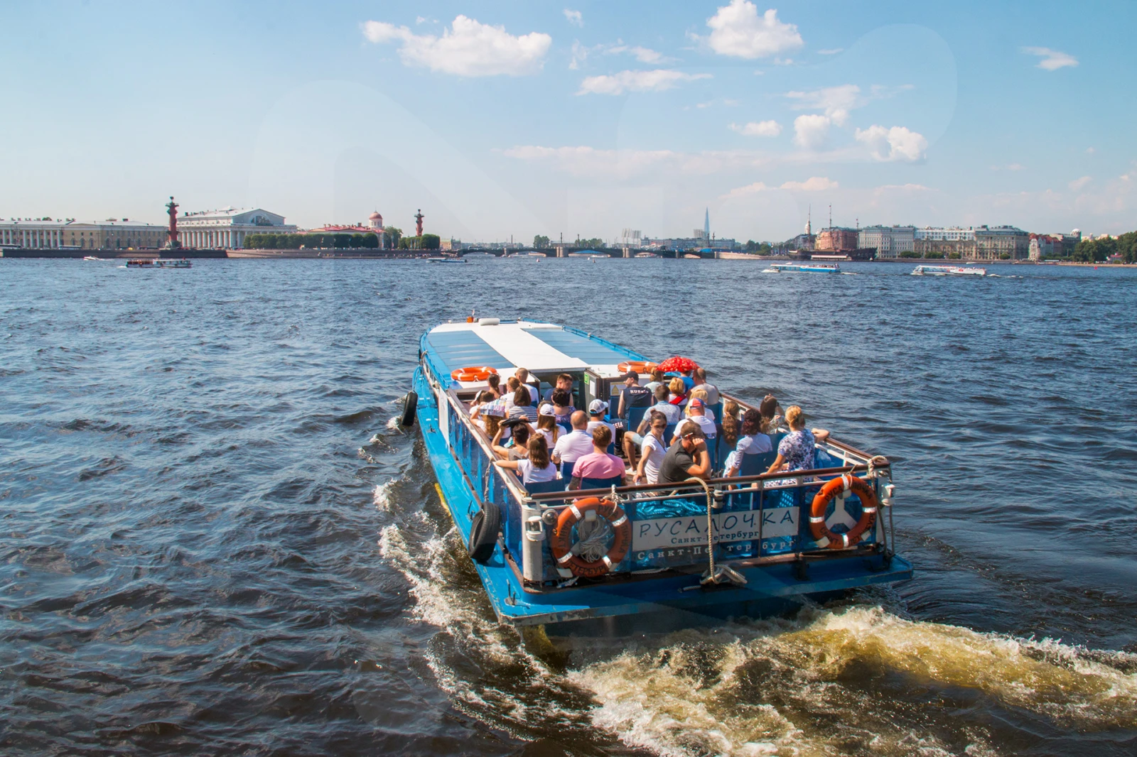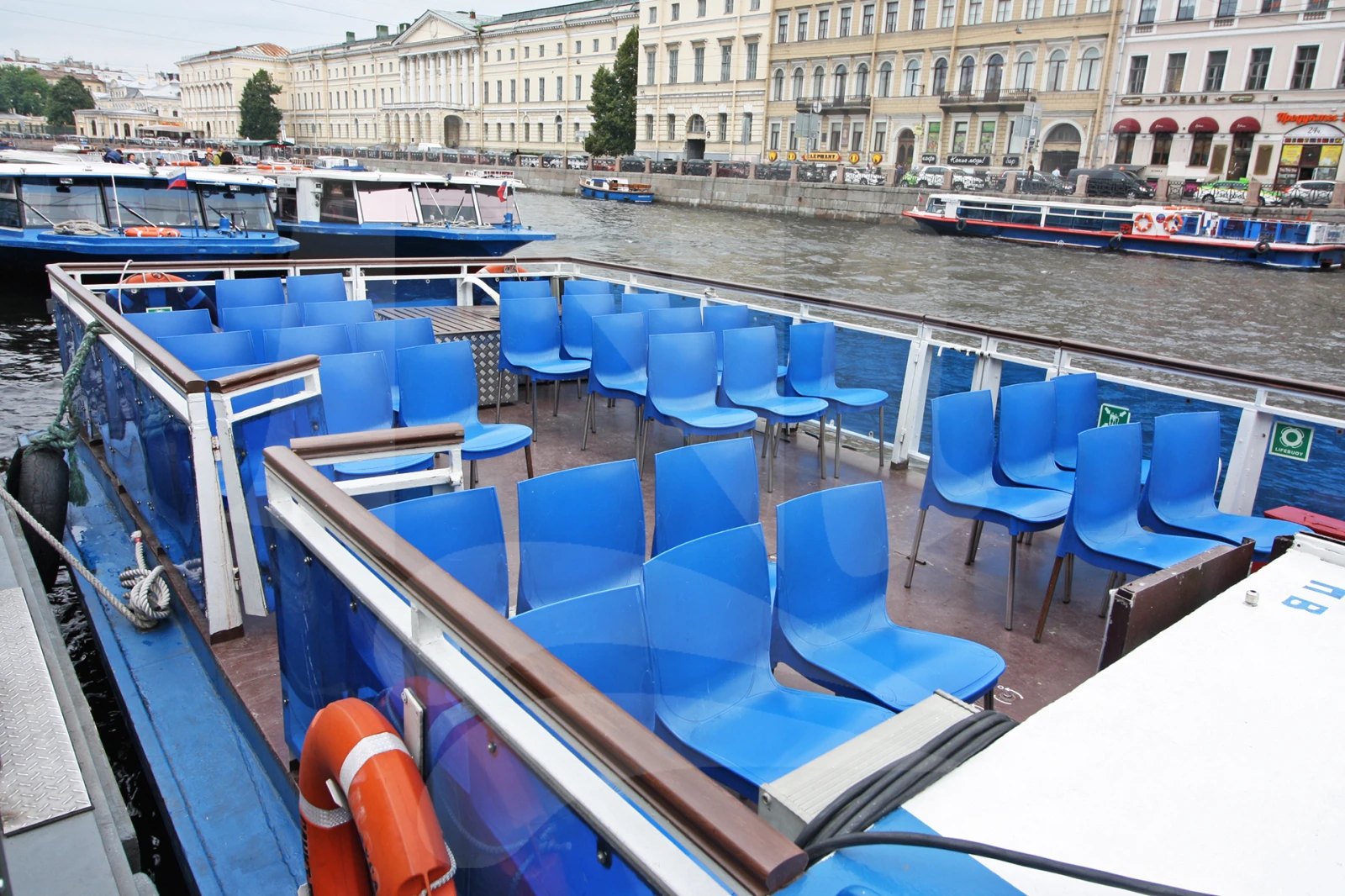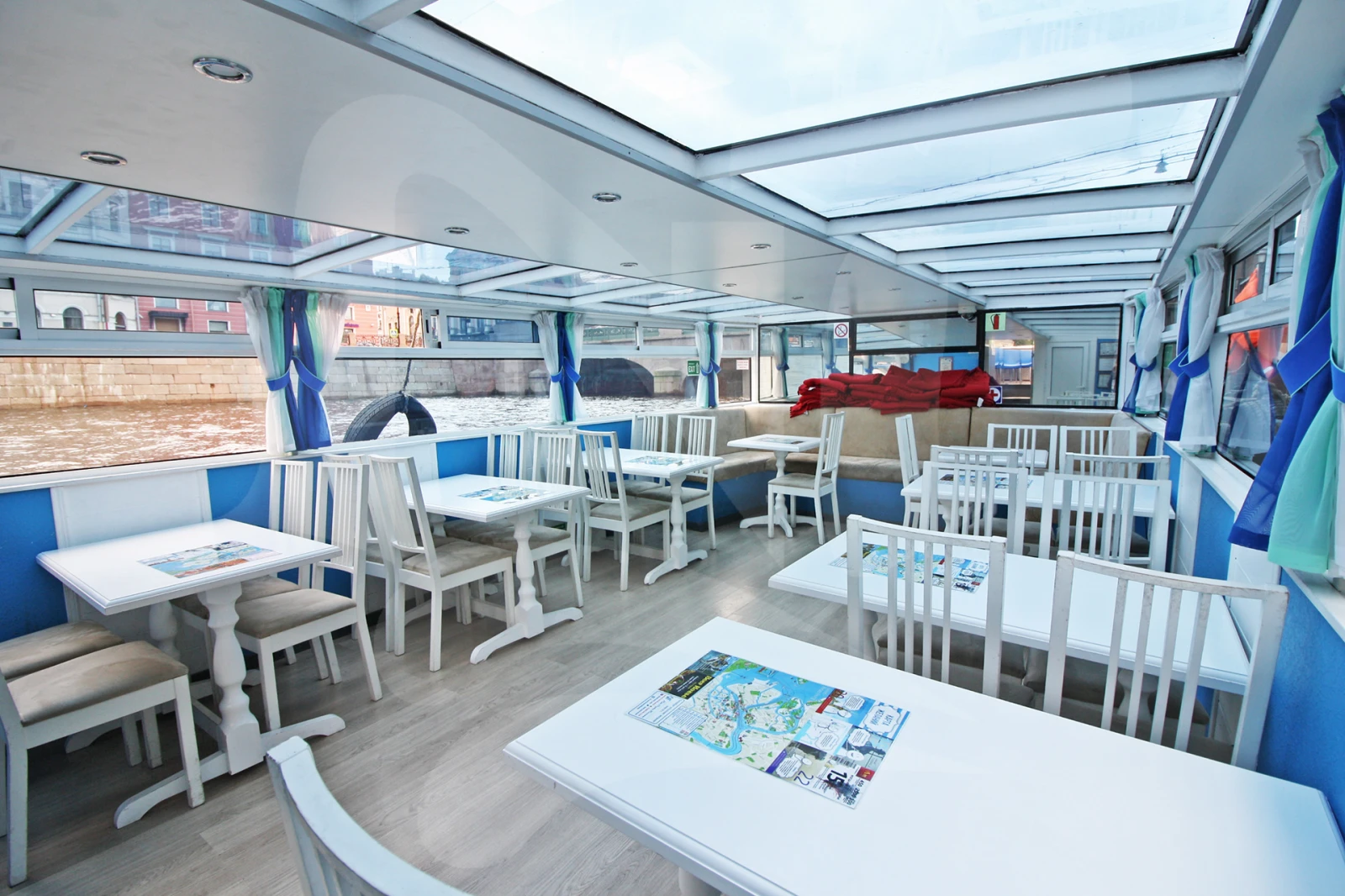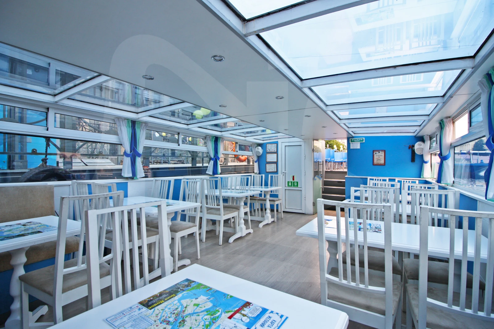 Небольшой прогулочный теплоход. Уютный светлый салон с панорамными окнами и стеклянной крышей, большая открытая палуба, в носовой части находятся мягкие кожаные диваны. В кормовой части салона расположен туалет с умывальником.
