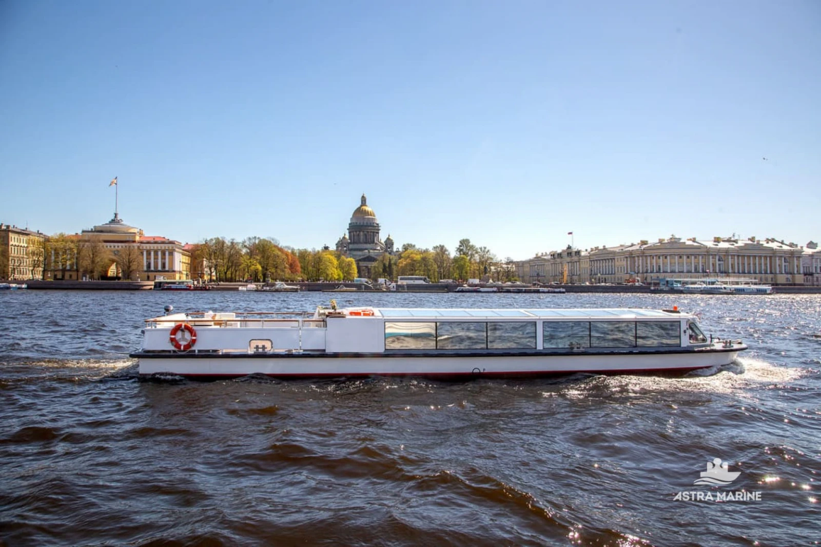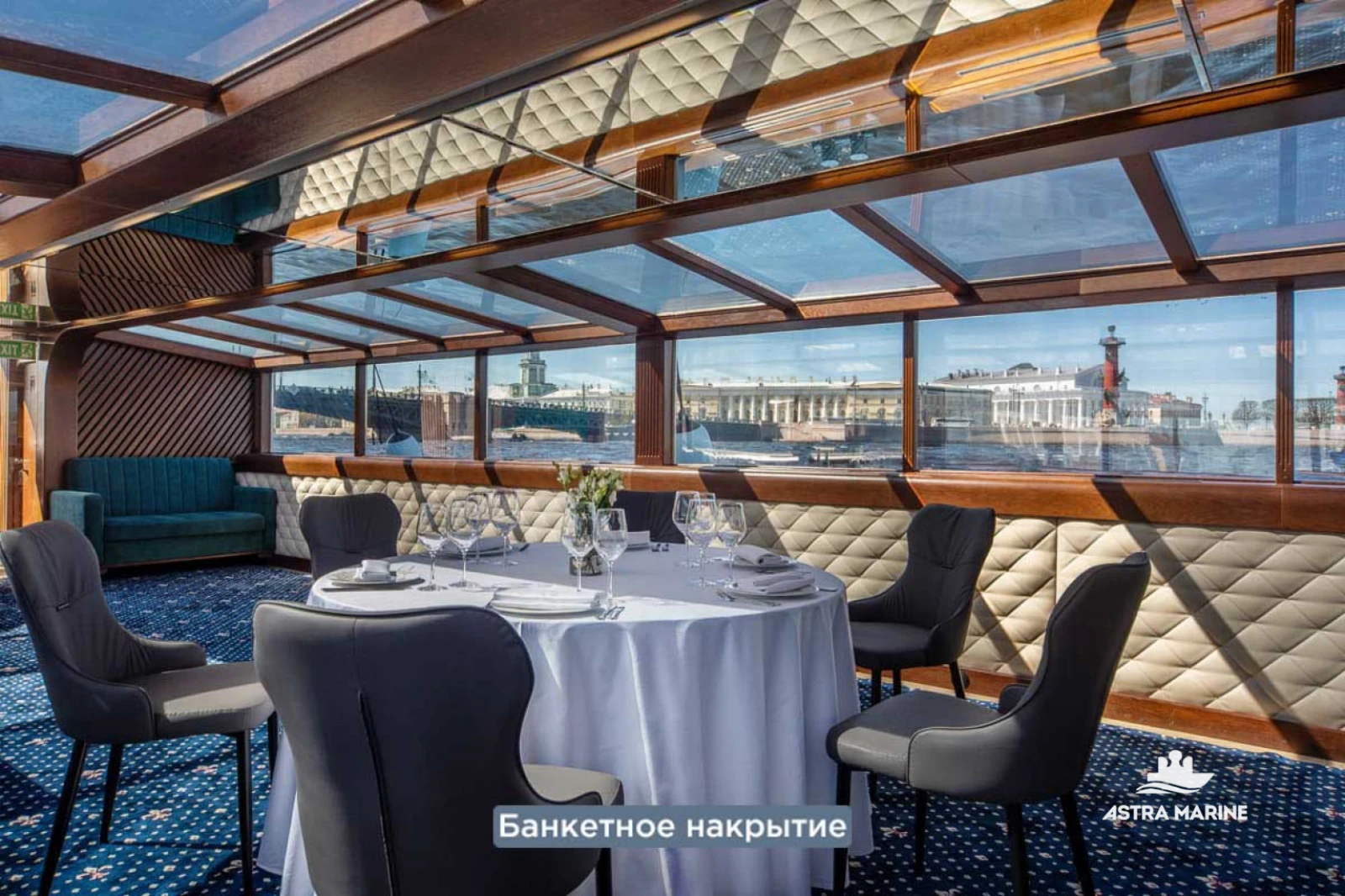 Панорамное остекление и стеклянная крыша позволяют любоваться парадным Петербургом во время Вашего мероприятия, создавая ощущение открытого пространства. Благодаря этому, несмотря на относительно небольшой по вместимости салон (до 50 персон), Ваши гости будут чувствовать себя комфортно.