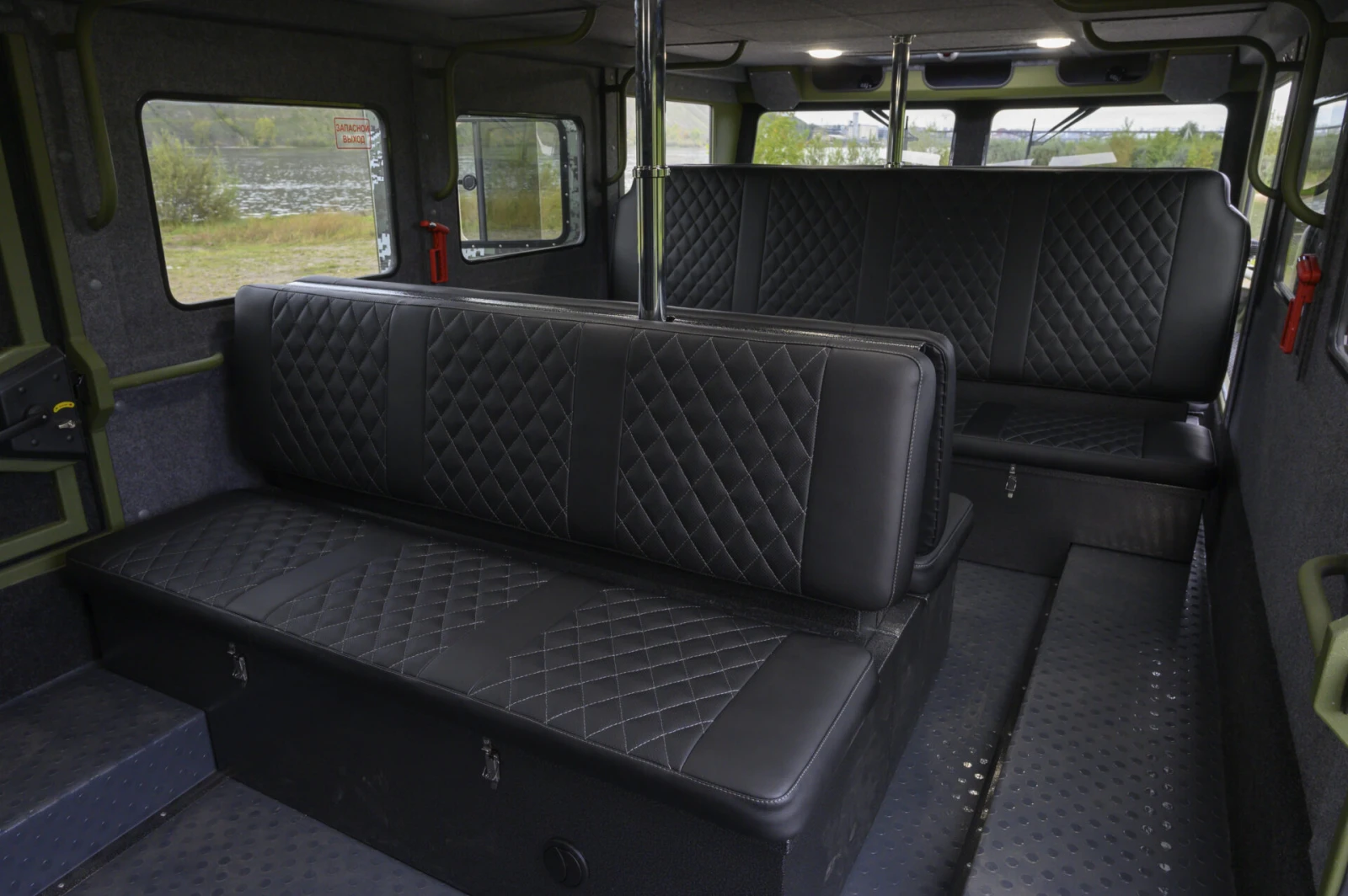 Задние сидения — сплошные, обивка так же из перфорированной кожи. За спинкой сплошного сидения располагается открытый вместительный сундук.