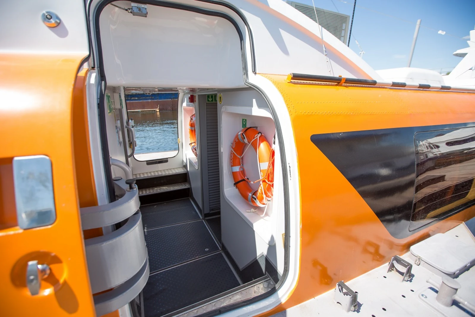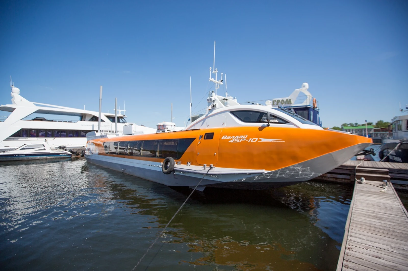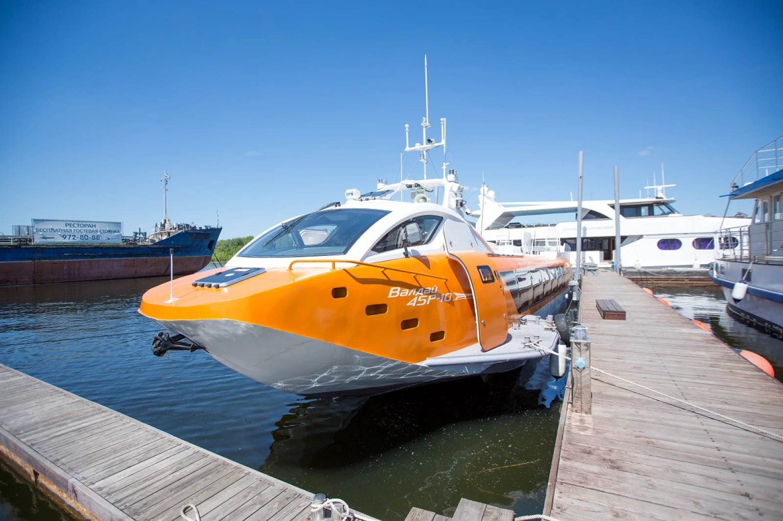 Теплоход «Валдай-45Р» — современное судно на подводных крыльях, предназначено для скоростной перевозки пассажиров в светлое время суток.
